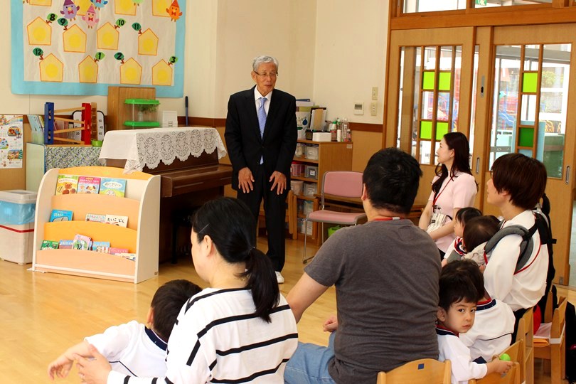 保護者の方に手をつながれて、緊張した面持ちで幼稚園にやってきた子どもたち。