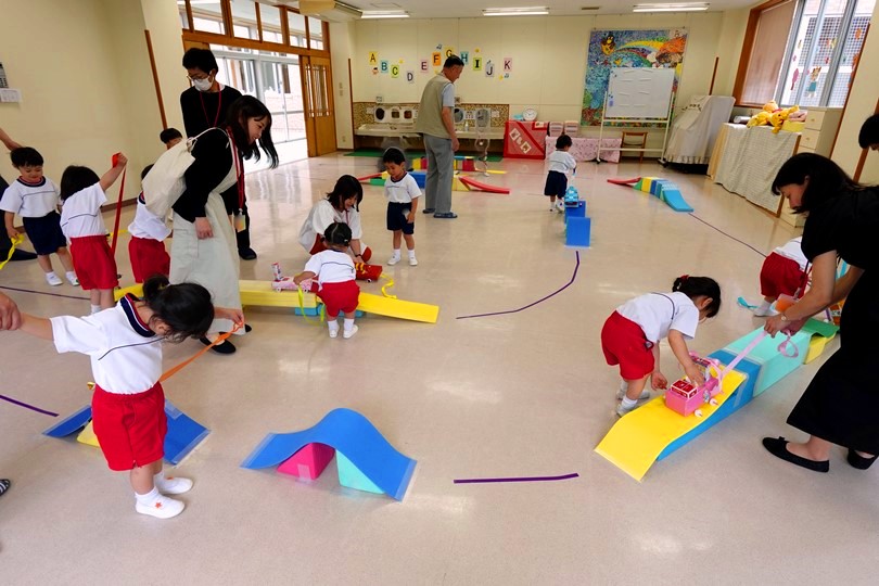 年少組は車作りです。パトカーや汽車、幼稚園のバスなど、とても楽しい車ができました。