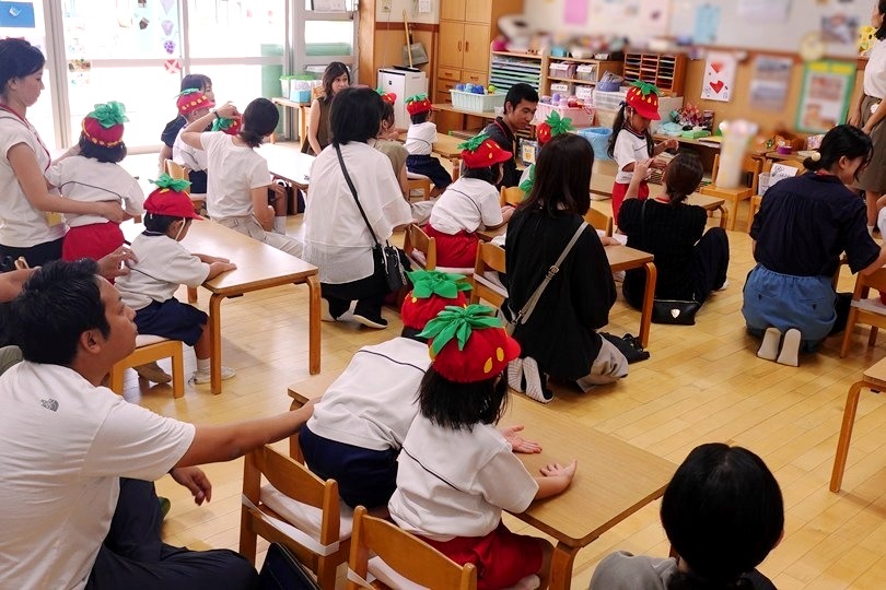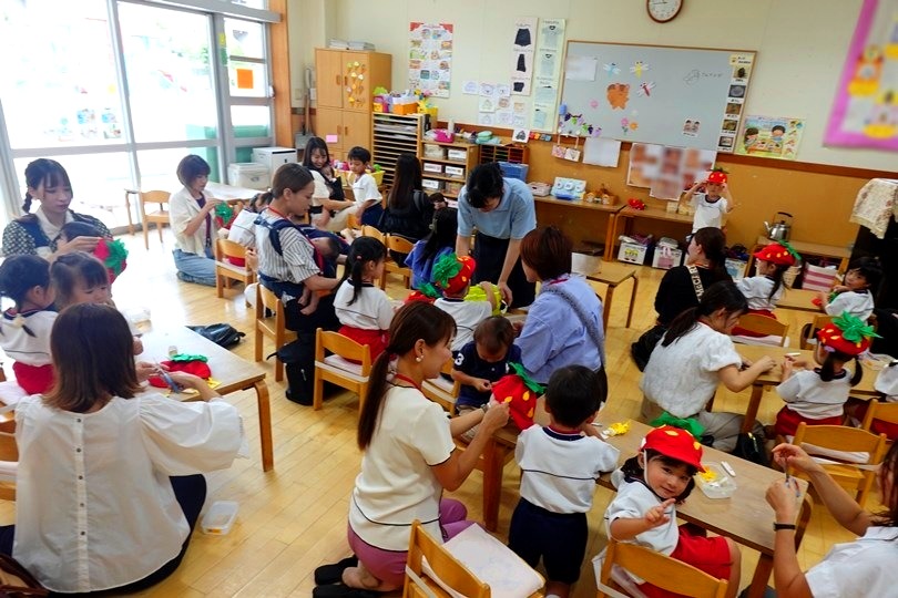 年少組では運動会で使用する、いちごの帽子を作りました。