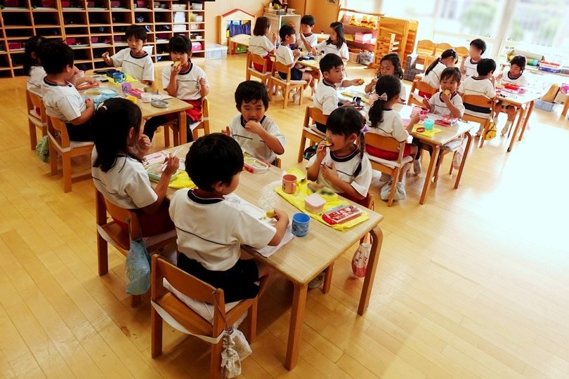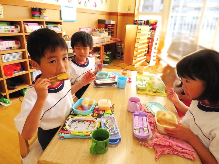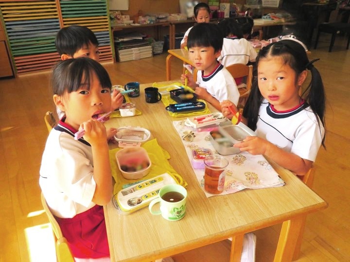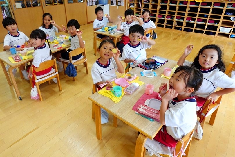 先日、年長組が園庭で収穫したサツマイモを蒸して、お弁当と一緒にいただきました。