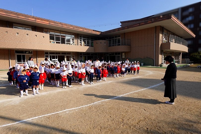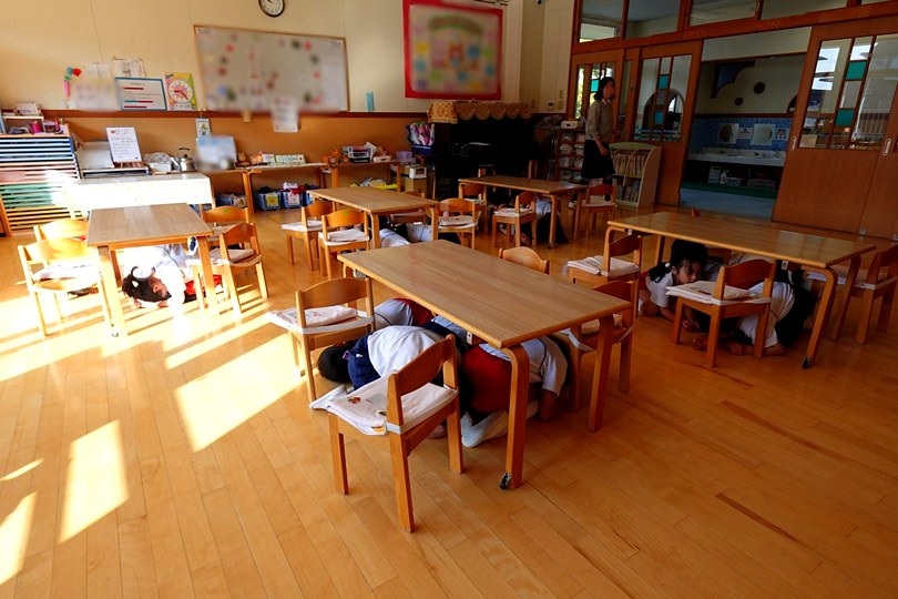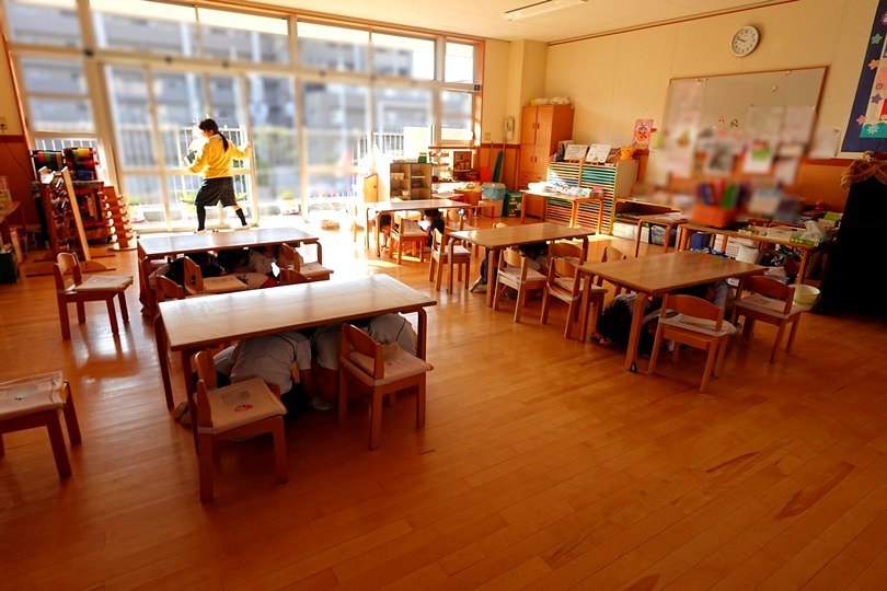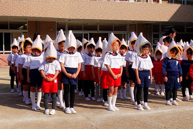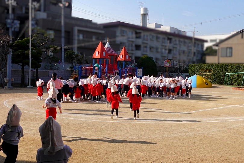 園内放送を聞き、まずは保育室で身を守り、その後、防災ずきんをかぶって園庭に避難しました。