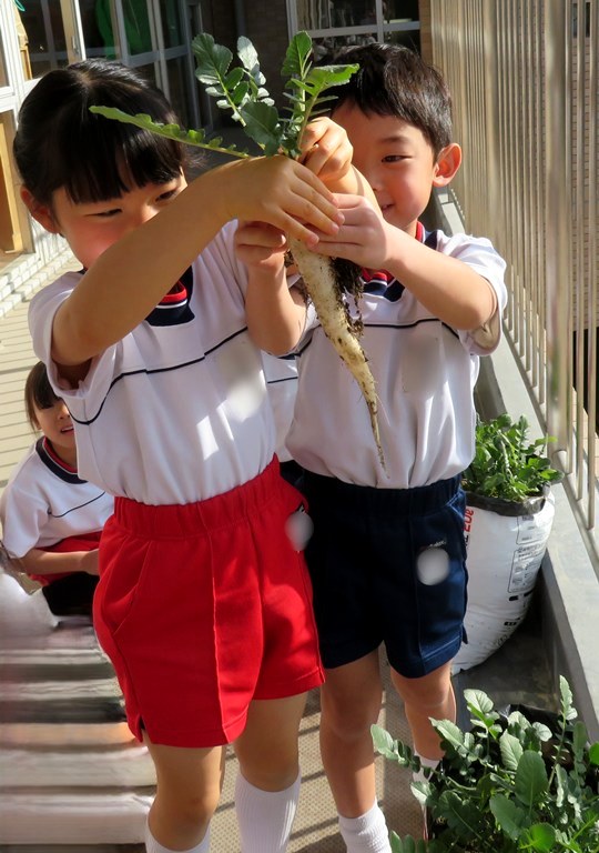 年長組が種から育てていた大根の収穫をしました。