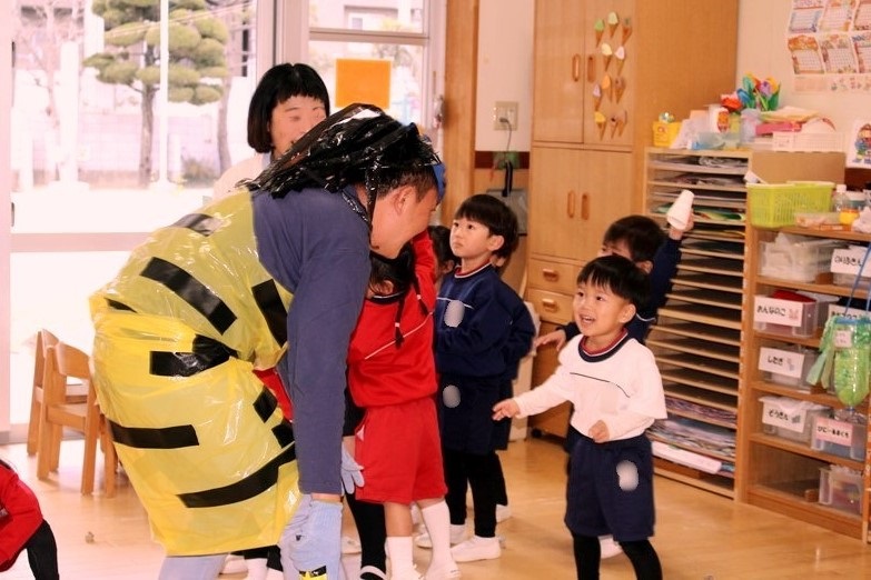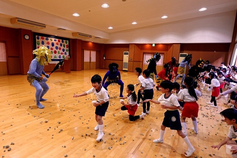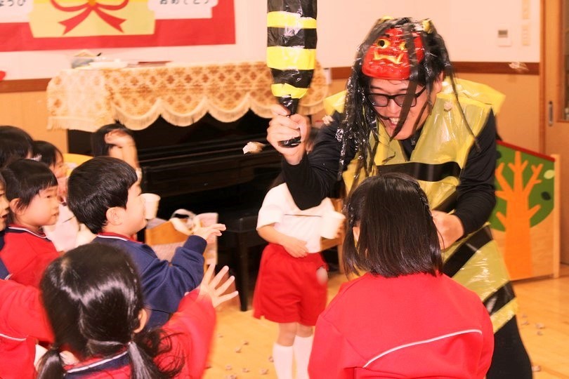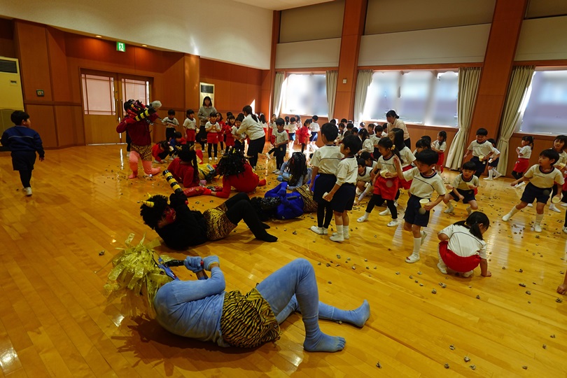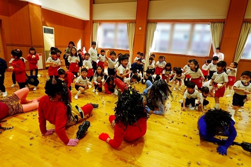 保育室で豆を準備して待っていると、「悪い子はいないか」と鬼たちが登場。