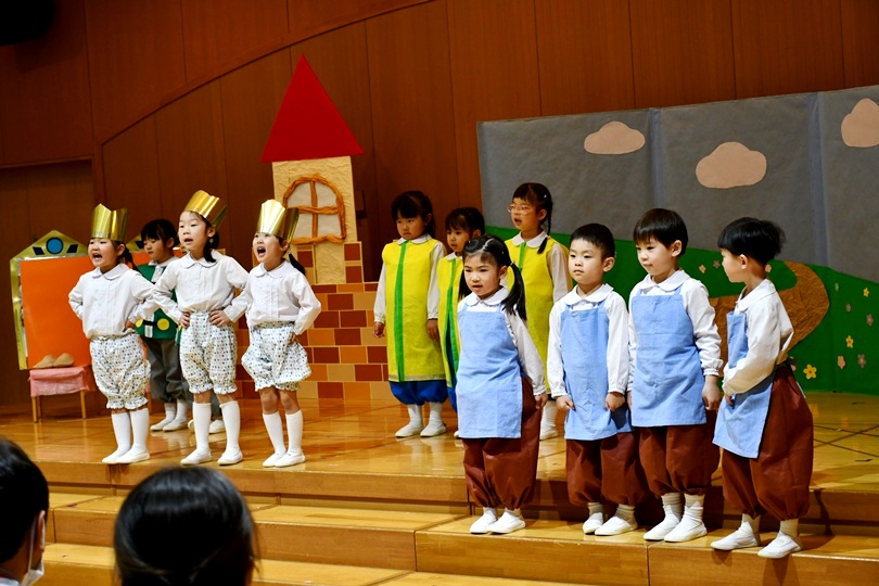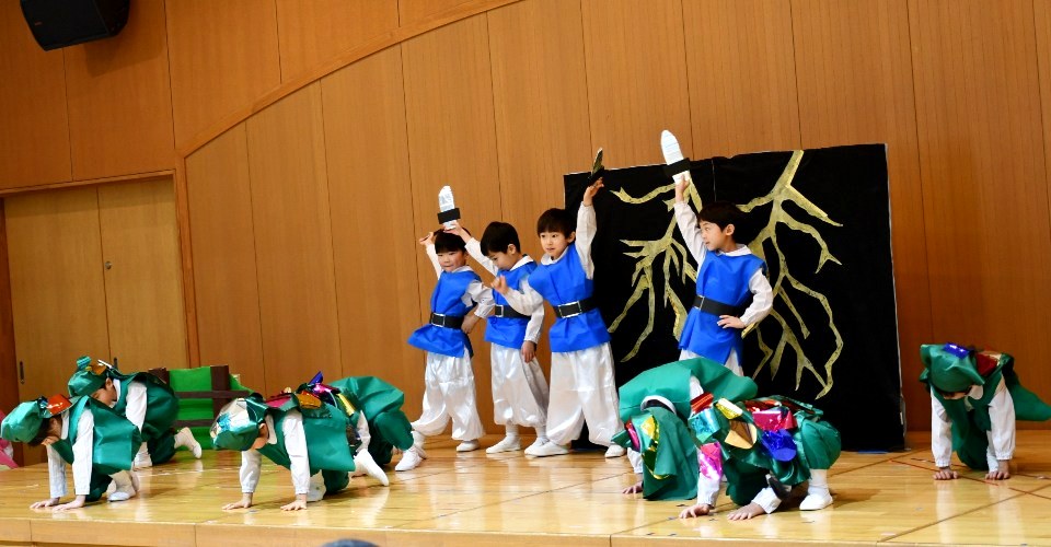 クラスの友だちや先生と心を合わせて作り上げた劇をしました。